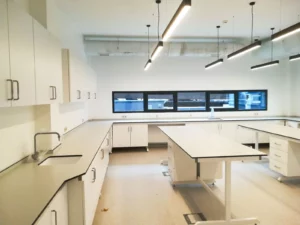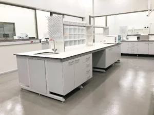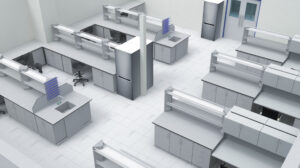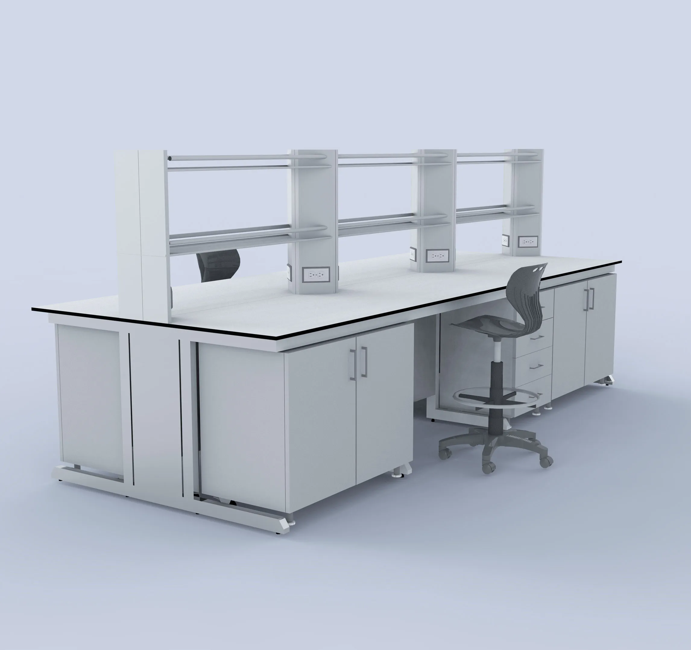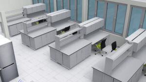 C-Frame lab benches are used for a variety of laboratory tasks, such as analysis, testing, experimenting, etc. Laboratory workbenches with C-Frames may include knee spaces and/or lower portions with storage cupboards.