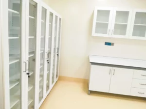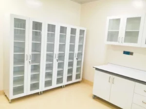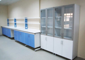 Material cabinets have the same structure as under-bench cabinets in the laboratory and are used for storing glass or laboratory materials. It is not recommended to store any kind of chemical. Adjustable shelf height feature provides flexibility in cabinet storage volume. HAFELE brand hinges in accordance with DIN 68857 standard, which can be opened at 110C, are used on cabinet doors.
