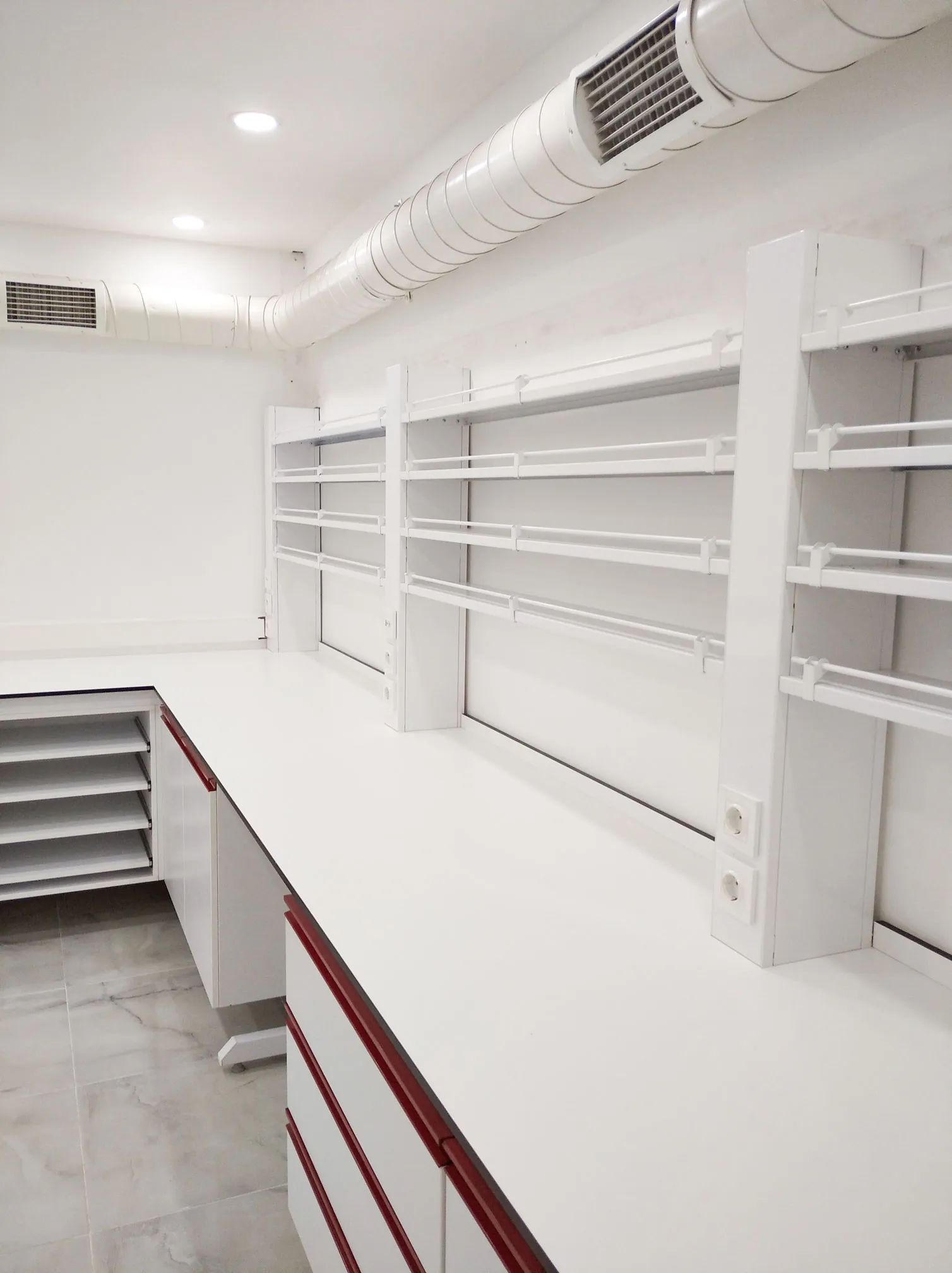 System of shelves on the laboratory bench: modifiable upon request. appropriate shelf systems for our items;